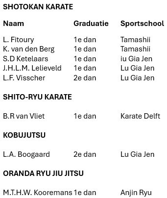Op zaterdag 11 april 2026 , worden de landelijke dan examens, respectievelijk Karate/Kempo/Ryu Kyu Kobujutsu en Jiu Jutsu NFK gehouden, in de dojo van LUGIAJEN, Baambruggestaat te Den Haag.